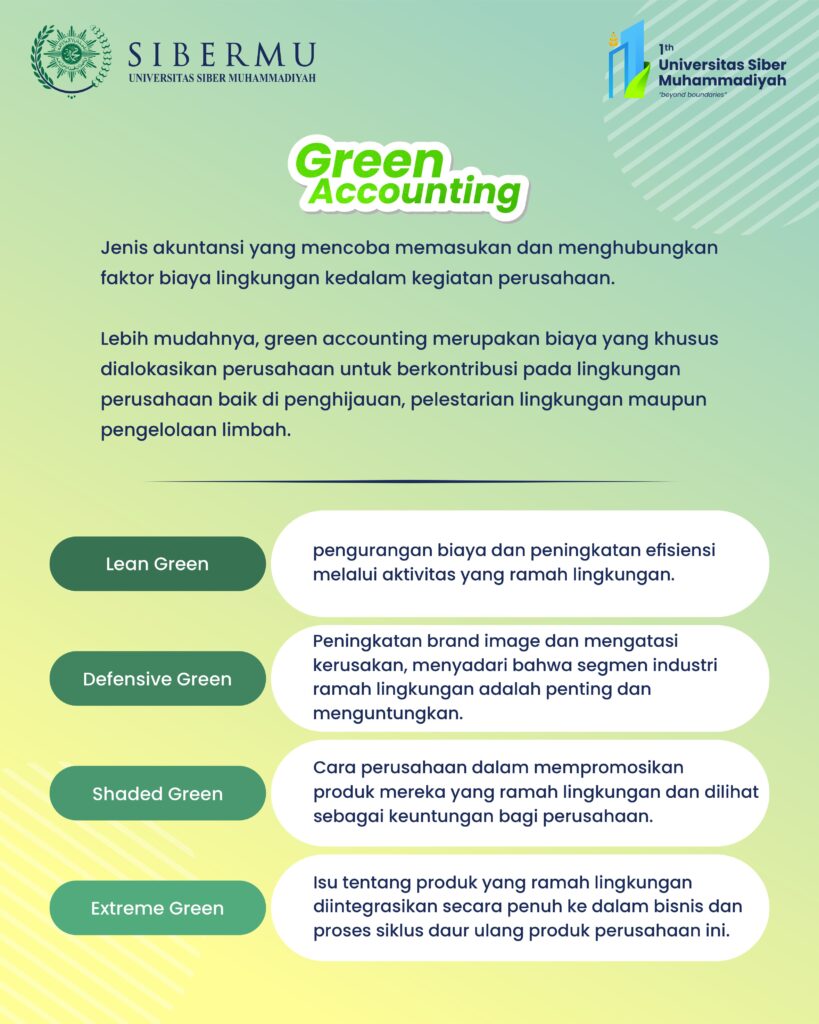 Green Accounting adalah adalah jenis akuntansi yang mencoba memasukan dan menghubungkan faktor biaya lingkungan ke dalam kegiatan perusahaan. Lebih mudahnya, green accounting merupakan biaya yang khusus dialokasikan perusahaan untuk berkontribusi pada lingkungan perusahaan baik di penghijauan, pelestarian lingkungan maupun pengelolaan limbah.